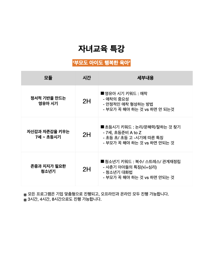 영유아 자녀를 둔 부모 부터 사춘기 자녀를 둔 부모 대상 교육을 진행합니다.